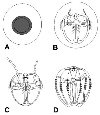 hatched embryo in cydippid stage, (D) embryo about 32 hours old showing muscular strands