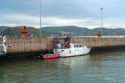 To begin, the long travel distance enabled only two Fish Core Team members, Grigore Davideanu and Gabor Guti, to join the Romanian National Fish Team. Strong winds made it impossible for them to sample by boat, forcing them to get out and wade along the shallow banks. Meanwhile, Fish Team leader Christian Wiesner staying on the Piscius experienced a very busy day. After his rodeo ride against the storm, and taking several showers while fixing things on deck, all of the ropes tying the small zodiac boat to the Piscius gave way to winds and tore. Until a supplementary rope was found, the zodiac had drifted over a hundred meters away. Thanks to the captain's careful manoeuvring, and despite the huge waves and storm, it was possible to catch and tie the boat again. But to fix it properly, Wiesner had a half-hour drill from the small, rocking platform at the ship's rear. Finally everything was in place again - for the moment. Suddenly, when the ship was about to enter the sluice of Iron Gate 2, the outdoor table, although tied to the railing, was blown off-deck, and Wiesner again had to fish more property out of the Danube into safety. Even entering the sluice was a challenge as the winds and waves pushed the Piscius against walls and other ships before everything was safe and calm.